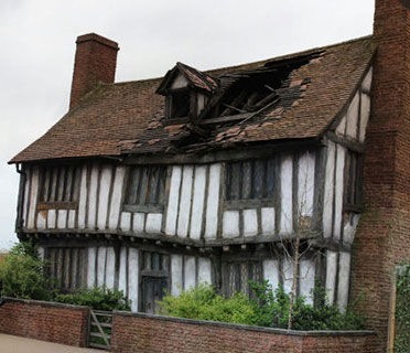 Die Kulisse steht im Außenbereich und man sieht im Dach die Auswirkungen des Fluches